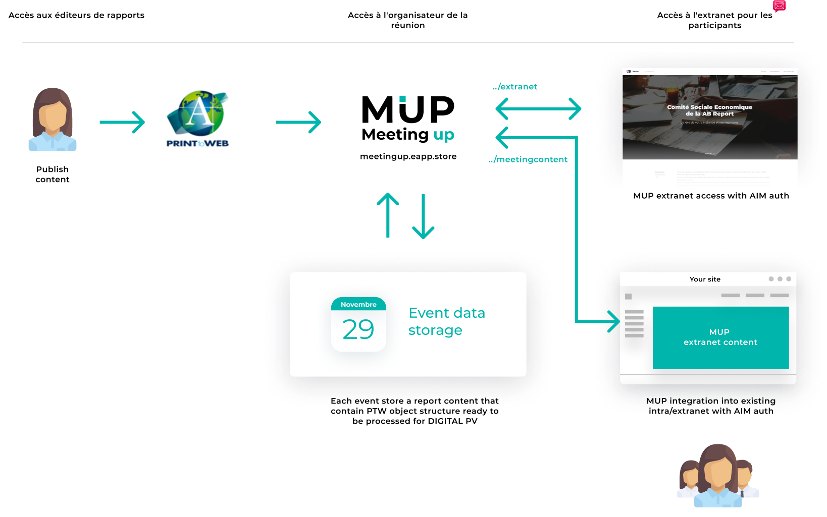 Contrairement à d'autres solutions, Meeting UP est une véritable plate-forme programmable avec des fonctionnalités puissantes, comme PrintToWeb, le courrier électronique dynamique, la génération d'Extranet, le système de vote, etc…